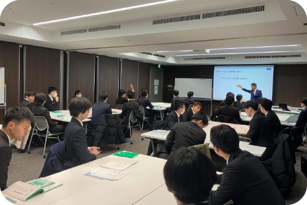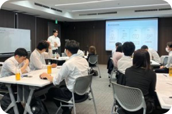 - 入社してすぐの導入研修で、仮想の文具メーカーの社員になって、グループのメンバーとポスター作成などの課題に取り組んだことは、大変な思いをしましたがとても楽しかったです。役割分担をしながら意見を出し合い、協力して課題を解決していく中で、自然と同期の絆を深めることができました。