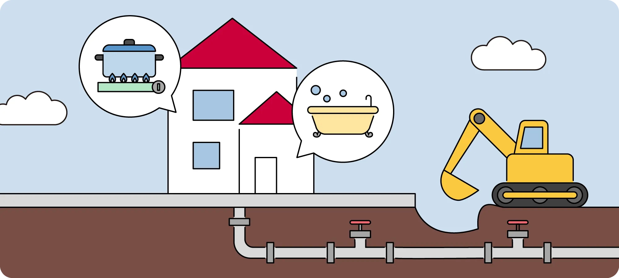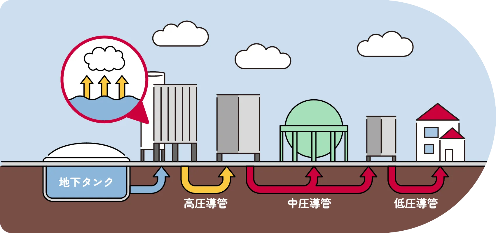 気体に戻されたガスは地下のガス管を通り、私たちの家に届けられています。
