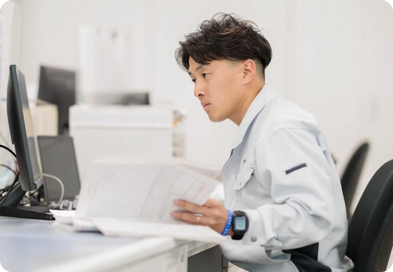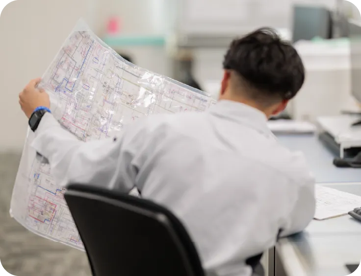 事務所に着いたら、現場を回っている間にPCに届いたメールをチェックします。工程に関するメールが多いので、確認漏れがないように気を付けながら図面を見て、現場の状況を把握して工程を整理します。