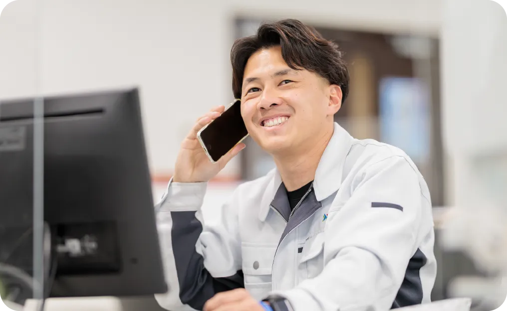 業務をスムーズに進めるためには、余裕をもって朝を迎えることが大切です。自動車通勤のため道路状況を考慮して、早めに家を出ます。事務所に着いたら、当日の施工予定を専用のサイトに入力します。