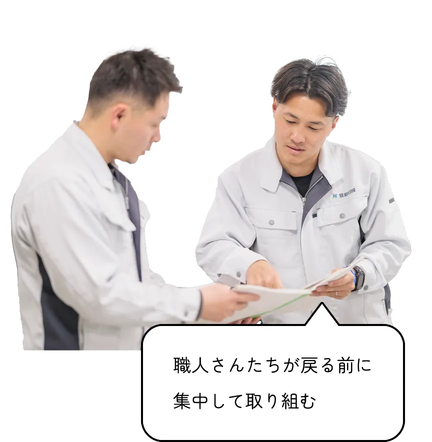 現場によってはスケジュールの遅延やトラブルもあるので、細かいことでも何か疑問を感じたら、すぐに現場担当の監督さんに確認します。急いでいるからと後回しにすると、かえって効率が落ちてしまうからです。